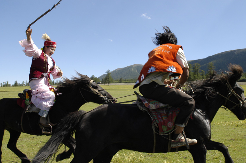 哈薩克族喜聞樂(lè)見(jiàn)、世代相傳的體育娛樂(lè)活動(dòng)有很多,其中具有代表性的主要有姑娘追、叼羊、賽馬、摔跤、馬上摔跤、騎馬搶布、騎馬拾銀元、馬上角力、馬上射箭等饒有趣味的體育娛樂(lè)活動(dòng)。這些活動(dòng)一般都在喜慶節(jié)日上集體進(jìn)行,充分體現(xiàn)了哈薩克族勤勞勇敢、機(jī)智聰明、剽悍粗獷的民族特點(diǎn)。與此同時(shí),這些體育娛樂(lè)活動(dòng)也是哈薩克族世代相傳的強(qiáng)身健體的方式與手段,也是哈薩克族群眾喜聞樂(lè)見(jiàn)的傳統(tǒng)的民間體育娛樂(lè)活動(dòng)。