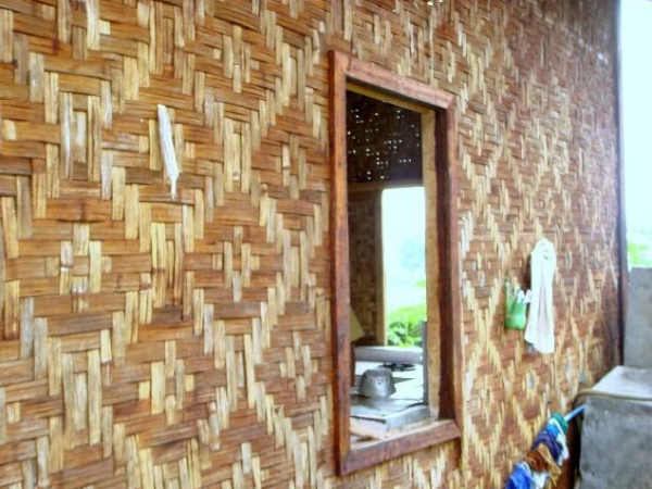 上層近梯處有一露臺,轉(zhuǎn)進為長形大房,用竹籬隔出主人臥室并兼重要錢物存儲處。其余為一大敞間,屋頂不甚高,兩邊傾斜,屋檐及于樓板,一般無窗。若屋檐稍高則兩側(cè)開有小窗,后面開一門。樓中央是一個火塘,日夜燃燒不熄。屋頂用茅草鋪蓋,梁柱門窗樓板全部用竹制成。