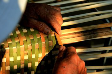 傣族竹編工藝是傣族的傳統(tǒng)工藝美術(shù)形式,歷史悠久,造型古樸,美觀實用。由于我國傣族主要聚居在云南等地的熱帶、亞熱帶地區(qū),居住地周圍多與竹子為伴,在生產(chǎn)生活中就地取材,形成了傣族世代相傳的主編技藝,具有著鮮明的民族特色。傣族竹編選材主要采用藤竹、粘竹、大黃竹以及巨龍竹等編織,將竹絲、篾片挑壓交織,被挑壓的篾為“經(jīng)”,編織的篾為“緯”,由經(jīng)與緯的挑壓可以編織出千變?nèi)f化的圖案,從而制作出千姿百態(tài)的竹編產(chǎn)品。代價的村村寨寨都掩映在竹林翠色之中,住的是竹樓,用的是各式自編的竹器,大至床、桌、柜、席,小至帽、盒、籃、簍,無一不為竹編。精美的竹編不僅是傣族人民的日常用品和生產(chǎn)工具,更是傣族人民生活藝術(shù)的外在表現(xiàn),它已與傣族人民融為一體,已經(jīng)成為傣族最重要的民族文化載體和文化傳播的媒介。