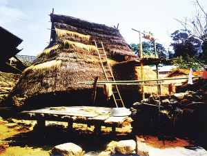云南省滄源佤族自治縣翁丁村的村民都是佤族,村寨建在大山里一個平緩的小山頂上。房屋依山勢地形而建,分布隨意,沒有一致朝向,多年自然生長形成的荊棘叢成為村寨的柵欄。進寨的路口有竹木搭建的寨門,寨子附近有茂密的竹林和充足的水源,還有保護很好的祭祀神林。寨內都是佤族的傳統(tǒng)民居——“四壁落地房”,即以3根帶長杈原木作柱梁,用平直的細木條作椽子,椽子上覆蓋事先編好的茅草排,用藤條綁扎固定。四壁用竹篾編成柵墻,向東面開一道門。房頂至房檐斜度大,房檐離地面不足1米,幾乎看到墻壁,以老虎窗(一種開在屋頂上的天窗)采光,并設小曬臺,當地人形象地稱之為“雞籠罩房”。