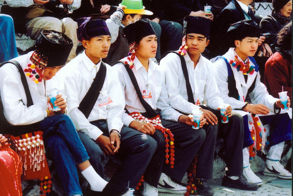 景頗族男子喜歡穿白色或黑色對(duì)襟圓領(lǐng)上衣,包頭各地略有差別,隴川縣北部王子樹、盈江銅壁關(guān)一帶的男子過去纏青布包頭或紅花格包頭,浪速纏紅布包頭,瑞麗、潞西和隴川的景頗族纏有絨球的白包頭。男子衣褲基本相同,穿對(duì)襟衣和長(zhǎng)褲?,F(xiàn)在的景頗族男子穿傳統(tǒng)對(duì)襟衣的已經(jīng)變少,多數(shù)改穿現(xiàn)代男裝。景頗族男子外出時(shí)常佩帶腰刀、筒帕、火槍等,以便自衛(wèi)和打獵。景頗族諺語中有“景頗山的路是長(zhǎng)刀砍開的,赤腳踩亮的”“男子不會(huì)耍刀,不能出遠(yuǎn)門”的說法。景頗男子十分喜愛長(zhǎng)刀,把刀視為第二生命,稱長(zhǎng)刀為“日恩途”,意為生命刀。景頗族中老年男子一般用紅、黑、白等色布作包頭,留長(zhǎng)發(fā),戴耳環(huán),佩戴銀項(xiàng)圈、銀手鐲。上衣以黑色為主,對(duì)襟,用銀吊做扣子。褲子短而寬,褲口用紅色、白色線繡花邊。黑布綁腿,腿套黑藤圈。青年男子頭包繡花包頭,身穿白襯衫,黑色對(duì)襟上衣。褲子短而寬,褲口用紅、白線秀花邊。腰系繡花腰帶,寬約5寸,長(zhǎng)約3尺。未婚的青年男子常把情人贈(zèng)送的耳環(huán)戴在耳朵上,項(xiàng)圈套在頸上。
