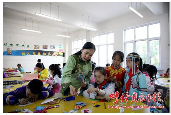 蘇梅在莫旗民族實驗小學,指導孩子們制作達斡爾族玩偶哈尼卡