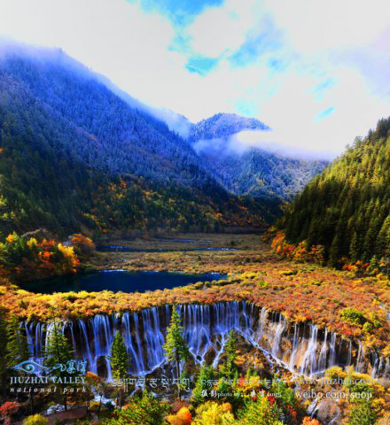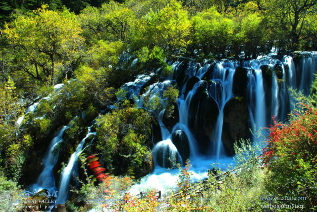 九寨溝是大自然鬼斧神工之杰作。這里四周雪峰高聳,湖水清澈艷麗,飛瀑多姿多彩,急流洶涌澎湃,林木青蔥婆娑。藍(lán)藍(lán)的天空,明媚的陽(yáng)光,清新的空氣和點(diǎn)綴其間的古老村寨、棧橋、磨坊,組成了一幅內(nèi)涵豐富、和諧統(tǒng)一的優(yōu)美畫卷,歷來(lái)被當(dāng)?shù)夭刈逋暈椤吧裆绞ニ?。九寨溝景區(qū)開放后,東方人稱之為“人間仙境”,西方人則將之譽(yù)為“童話世界”。