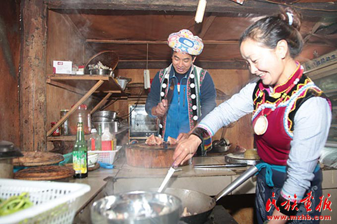 早上,老姆登村73歲的怒族老人斯普早早起來招呼兒子郁伍林、兒媳魯春花:“春節(jié)快放假了,客棧的生意會忙得不可開交,趁著現(xiàn)在客人不多,家里人先吃一頓團(tuán)圓飯吧?!彼蛊绽习樵缒赀^世,7個兒女中老五郁伍林在身邊照顧她?!斑^去在春節(jié)才能吃上一頓好飯菜,也要準(zhǔn)備很長時間,現(xiàn)在每天都有好吃的,天天在過年,多虧了黨的好政策?!闭f起今天的幸福生活,生在舊社會的斯普感慨萬千。