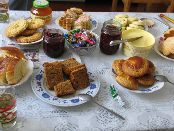 俄羅斯族人的主食主要是自己烤制的列巴(一種較硬的面包)和煎餅,副食有肉、雞蛋、灌腸、牛奶、黃油等,他們喜歡吃俄式夾餡面包和無(wú)餡面包及各種糕點(diǎn),喜歡吃烤鵝、烤牛肉片、牛肉煮土豆、雞蛋腌豬肉片等俄式熱菜,喜歡吃黃瓜、西紅柿、土豆、胡蘿卜、圓白菜等蔬菜。愛(ài)喝加有牛肉和土豆的各種菜蘇波湯、白酒(伏特加)和自己釀制的醇香甜美的啤酒。他們的日常飯菜主要有俄羅斯風(fēng)味的黑列巴、布拉其尕、魯列特、古力其、比羅哥、蘇波、尕德列得、土豆燒牛肉、比羅什給、布里內(nèi)、阿拉嘰等。