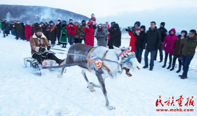 在呼倫貝爾冬季的冰雪風(fēng)情節(jié)上,鄂溫克族的馴鹿拉著雪橇,吸引了許多游客的目光(武倩 攝影)