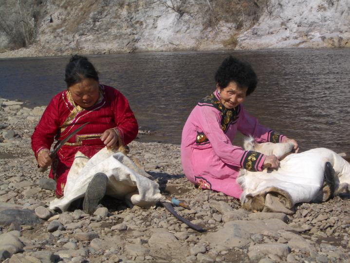 鄂倫春人過去在家庭公社“烏力鄰”里,同生產共消費,在當時生產力十分低下的情況下,憑著扎槍和弓箭,單個人很難獲得能夠滿足衣食需要的獵物,必須要有“烏力鄰”全體成員的通力合作,才能戰(zhàn)勝兇猛和龐大的野獸,所以,在“塔坦達”領導下的集體狩獵是當時最主要的勞動形式。隨著生產力的不斷發(fā)展和個體小家庭的大量流動,不僅社會組織“烏力鄰”由原來血緣性的家庭公社演變?yōu)榈鼐壭缘牡赜蚬?,勞動組織也隨之發(fā)生了極大的變化。集體狩獵已不再是“烏力鄰”傾巢出動,而是由幾個小家庭的成員自愿結合成“安嘎”來進行。同時還出現(xiàn)了集體和個人等多種勞動形式。狩獵也不再單純是為了滿足衣食的需要,剩余獵物可以拿去交換,獵產品已趨于商品化。故此時一些珍貴的細毛皮張和藥用價值較高的獸類,成了鄂倫春人主要的狩獵目標。這樣就形成了一年中的四個狩獵旺季,即:農歷正月至2月是“鹿胎期”;4月至6月是“鹿茸期”;9月至落雪為“叫鹿尾期”;落雪后至來年開春是“打皮子期”。大概是源于原始的圍獵,鄂倫春人把狩獵叫“打圍”,而這四個狩獵旺季就叫“紅圍期”。“紅圍期”除“叫鹿尾期”外,都組織“安嘎”集體出獵。“安嘎”是一種臨時性的狩獵組織,狩獵旺季將臨時,由一人發(fā)起,串聯(lián)幾位親朋好友或志趣相投的人組成一個“安嘎”,待獵期結束,“安嘎”自行解散,下次出獵時再重新組合,因此其成員并不是固定的(圖為熟化狍皮,吳雅芝攝影)。
