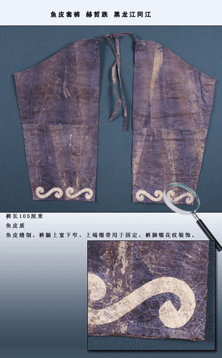 套褲的形式只是兩個(gè)筒形褲腿,沒有褲腰,男式的上端為齊口,女式的上端為斜口。赫哲族人稱男式魚皮套褲為 “臥又克衣”,褲邊口有皮條,是用來扎結(jié)用的。赫哲族人稱女式魚皮套褲為“嘎榮”,口呈月牙形狀,前邊到腰部,后邊到大腿根部。如圖所示,女式魚皮套褲,長105厘米,褲腿上寬下窄,上端系有綴帶,褲腳綴有“S”形紋飾。魚皮褲造型與普通褲子基本一致,褲腰和褲襠部較為寬松肥大,褲腿稍窄些。