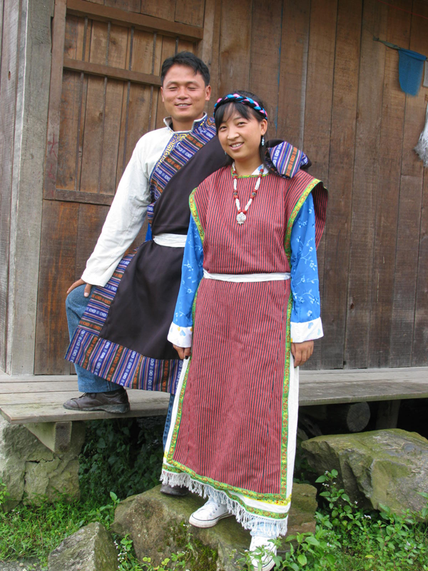 門隅地區(qū)的男女都喜愛(ài)用羊毛織品氆氌為原料,穿氆氌袍和絳紅色的長(zhǎng)袍,腰間系一條赭色腰帶;女子內(nèi)衣以棉織和蠶織品做原料,顏色絢麗多樣,無(wú)開(kāi)襟、無(wú)領(lǐng)、無(wú)扣子,只開(kāi)一個(gè)圓口或三角口由頭套穿。外加長(zhǎng)袍及上身穿黑氆氌做的“熱故”(門巴語(yǔ),留有邊子的短服),下身腰部圍一塊白氆氌做的“吉瑪”(門巴語(yǔ),圍裙)圍裙,并在圍裙右下角綴有“雍仲”(藏語(yǔ),意為堅(jiān)固、永固。原始宗教苯教奉為神秘字,并以左旋逆時(shí)針?lè)较蛑巫旨y作為代表)吉祥圖案,有的繡有“日月吉祥”圖案。