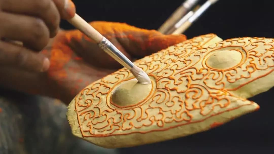 在等待膠布面具晾干的時(shí)候,扎西去到了兒子練習(xí)跳舞的地方,在外面遠(yuǎn)遠(yuǎn)的看著兒子練舞。原本希望兒子繼承他這手藝的心思,在看到兒子真心喜歡藏舞后,也被漸漸放了下來(lái)?;氐郊抑?,膠布面具已經(jīng)干透,開(kāi)始了制作面具中最重要的一環(huán):上顏色。隨后上頭發(fā)、簪子等小零件,一個(gè)薩迦面具終于制作完成。