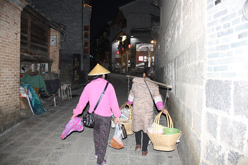 晚上7點多鐘,一群在小河里撲騰了一天的鴨子排著隊憨態(tài)可掬地回到寸家灣巷口,忙碌一天的人們也開始回家。我正擔(dān)心晚上約定的采訪找不到地方,卻在圖書館旁邊的小巷里碰到了收工回家的姜聰留。她今天的松花糕賣了一板半,收入100多元。同行的一個姐妹幫她挑著擔(dān)子,姜聰留自己提著袋子和板凳,一路無語。臨近家門的路口,姜聰留從姐妹肩上接過擔(dān)子,眼神默契相視后,各自回家——這就是她們的生活。晚飯姜聰留到丈夫的大哥家吃土鍋子,兩家的院子只隔一墻,我也跟著進了大哥江宗良的家門。