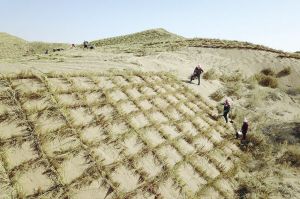 在甘肅省古浪縣北部沙區(qū)旱麻崗治沙點,八步沙林場治沙人和群眾一起扎草方格壓沙。 新華社記者 范培珅攝
