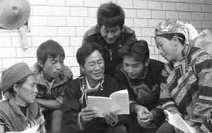 四川省西昌市大箐鄉(xiāng)民主村彝族群眾學(xué)習(xí)彝文版《十七大報告》。 資料圖片
