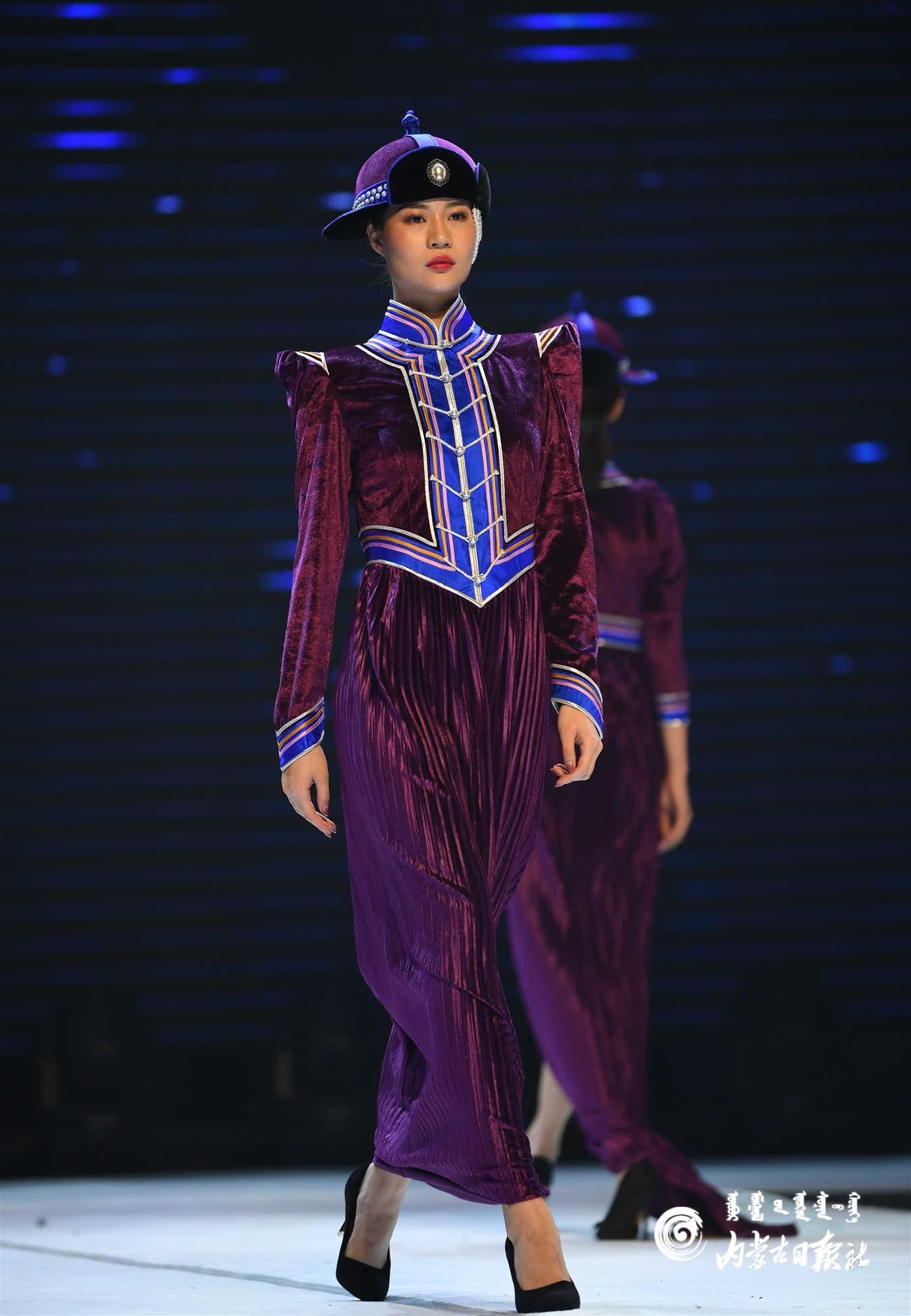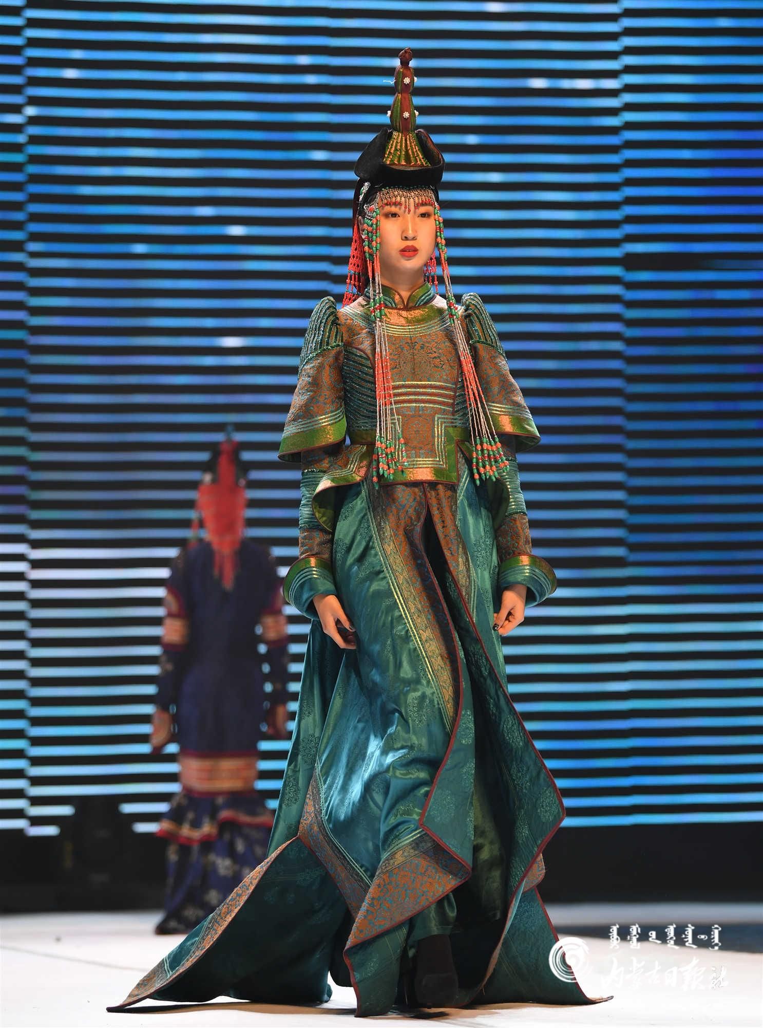 內(nèi)蒙古藝術(shù)學(xué)院的學(xué)生在舞臺(tái)上展示蒙古族禮服。