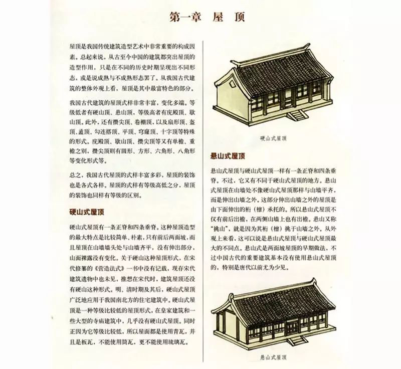 硬山式屋頂有一條正脊和四條垂脊。這種屋頂造型的最大特點是比較簡單、樸素,只有前后兩面坡,而且屋頂在山墻墻頭處與山墻齊平,沒有伸出部分,山面裸露沒有變化。關(guān)于硬山這種屋頂形式,在宋代修纂的《營造法式》一書中沒有記載,現(xiàn)存宋代建筑遺物中也未見,推想在宋代時,建筑屋頂還沒有硬山這種形式。明、清時期及其后,硬山式屋頂廣泛地應(yīng)用于我國南北方的住宅建筑中。硬山式屋頂是一種等級比較低的屋頂形式,在皇家建筑和一些大型的寺廟建筑中,幾乎沒有硬山式屋頂。同時正因為它等級比較低,所以屋面都是使用青瓦,并且是板瓦,不能使用瓦筒,更不能使用琉璃瓦。
