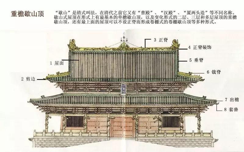 7. 出檐:在帶有屋檐的建筑中,屋檐伸出梁架之外的部分,叫做“出檐”。