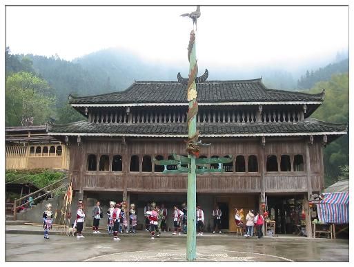 蘆笙坪面積約有一個(gè)籃球場大小,四周都是吊腳木樓。坪中央豎立一根雕刻有錦雞、水牛角、龍等圖騰物的蘆笙柱。有的蘆笙坪還專門用卵石圍繞蘆笙柱排列鑲砌成各種圖案。蘆笙坪是經(jīng)過眾議開辟留下的,任何人不得侵犯和占用,也不能堆放雜物,是全寨的公共財(cái)產(chǎn)。