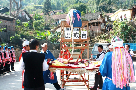 “度戒”臺(俗稱“巫臺”,亦稱“神臺”或“五臺山”)設(shè)在村子下面的一塊小地里,因這次有兩人“度戒”,便并列設(shè)了兩個“巫臺”?!拔着_”搭得較簡單,先在場地上打4棵木樁,用四方桌作臺頂,桌子的4腳分別捆在木樁上,臺高約4米;“巫臺”前搭有一架有5個臺階的木梯,等“度戒”者送上臺后便把木梯砍掉;臺后有一張用大青藤編成的狀如蛛網(wǎng)的大網(wǎng),上面鋪著幾床新被子,約有10人對稱拉開,等“度戒”師下令,“度戒”者從“巫臺”上仰面滾落下來。拉網(wǎng)的人乘“度戒”者墜落進(jìn)網(wǎng)之勢,把他輕放于地上,并將手中之繩速向?qū)Ψ綊仈n,“度戒”師看了其落地的姿勢可以,此次“度戒”便算成功了。