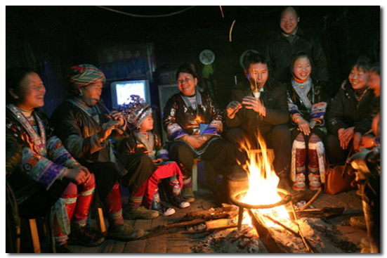 苗族起木樓很注重火塘的設(shè)置,特別留出二樓正中的大半廂作火塘?;鹛劣脤捄窭仙寄景彖傊瞥梢粋€(gè)長(zhǎng)寬約一點(diǎn)五米,深約六十公分的正方形木槽,槽內(nèi)用粘性強(qiáng)的黃泥巴填滿舂緊,正中央安放有三腳鐵架,用于架鍋煮食?;鹛潦侵笫?、進(jìn)餐、取暖、會(huì)客、議事、祭祀的地方,又是年輕人走妹行歌、談情說(shuō)愛(ài)、舉行婚禮儀式的場(chǎng)所。因此苗家人對(duì)火塘是十分看重的。