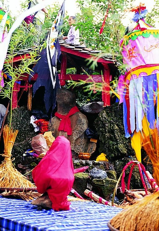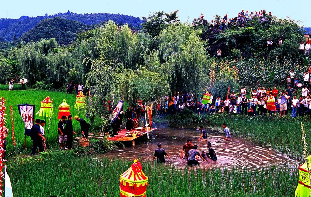 敬霞儀式在霞堂舉行。霞堂設(shè)有祭壇。壇前立著一根竹竿,竿頂上站立一只公雞。祭壇中是主祭席,其友有用松針鋪成十二個祭祀點,由宗族各支系擺設(shè)祭品。敬霞這天,各支系由德高望眾者領(lǐng)隊。抬著豬肉、糯米飯、米酒等食品列隊進入霞堂。一路上銅鼓、銅鑼、欽、革鼓被敲得冬嚏冬嚓地響,人們跟在后面吆喝著前進。祭典開始,鑼鼓暄天。接著由執(zhí)壇的水書先生念讀敬霞的祝詞,內(nèi)容多為祈福禳災(zāi),期冀風調(diào)雨順,人壽年豐之類。祝詞之后便酪酒祭之:此后,由兩個身穿白衣的小伙子抬一母豬到田壩中繞行,后面那位不時用松針刺戳豬的尾部,使它發(fā)出嗥叫聲。圍觀的人常常發(fā)出哄笑,并且盡情地用竹片屏水和撮稀泥向抬豬者灑淋過去。走過霞堂之后,抬豬者丟下母豬,故意穿進圍觀的人群,嚇得人們四處躲避。這種逗趣結(jié)束之后,水書先生再度念讀咒詞,當他手中的執(zhí)法彩杖一揮時,飼雞者便學雞嗚,逗引竹竿頂上的公雞啼鳴。這時,主祭者就向眾人高呼:等待霞神降雨來沐浴。此后,水書先生再念祝詞,又酹酒祭之。然后由各族系代表抬著"酒壇去澆灌"霞神"。人們用酒從頭澆到腳,一直澆到"霞神"們倒(象征酒醉)才算祭祀的成功。