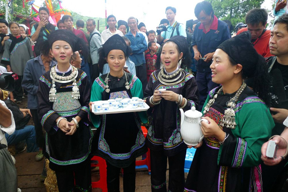 人們傳說只有醉倒了"霞神",它才能永遠留在這方,才能使這里風調(diào)雨順。當水書先生念了最后的咒詞,祭典才在鼓樂聲和歡呼聲中結(jié)束。最后,各族系將祭肉一并聚攏,聚餐慶祝。天黑之后,人們秘密地將"霞神"收藏起來,至此,"敬霞"活動全部結(jié)束。
