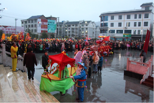 2019年2月16日農(nóng)歷正月十二是瓦寨鎮(zhèn)傳統(tǒng)大型集會(huì)活動(dòng)日,舞龍為主要活動(dòng)之一。午飯后,來(lái)自全縣各地的舞龍舞獅隊(duì)、花燈隊(duì)陸續(xù)到瓦寨政府廣場(chǎng)集結(jié),并在廣場(chǎng)右側(cè)有序排隊(duì)等待,各隊(duì)隊(duì)員精神抖擻、神采飛揚(yáng)、迫不及待。前來(lái)參觀元宵舞龍的群眾和游客也不斷涌向廣場(chǎng),大街小巷行人猶如潮涌,吆喝聲、歡笑聲、鑼鼓聲連綿不斷……下午五時(shí)許,活動(dòng)在瓦寨鎮(zhèn)政府廣場(chǎng)正式開(kāi)始,先是由鎮(zhèn)領(lǐng)導(dǎo)對(duì)脫貧攻堅(jiān)各項(xiàng)惠民政策及5年來(lái)瓦寨取得的攻堅(jiān)戰(zhàn)績(jī)進(jìn)行宣講,宣講慳鏘有力、扣人心弦,特別是5年來(lái)瓦寨取得的攻堅(jiān)戰(zhàn)績(jī),一致得到人民群眾好評(píng)和認(rèn)可。隨后,舞龍、舞獅、花燈表演紛紛上演,只見(jiàn)黃龍時(shí)而上下翻騰,時(shí)而昂首擺尾,雄獅時(shí)而就地打滾,時(shí)而賣(mài)萌撒嬌,樣子憨態(tài)可掬,花燈表演幽默滑稽,在前行中跑出各種套路,起伏波動(dòng)、生動(dòng)活潑,吸引了所有人的目光,贏得了陣陣喝彩……