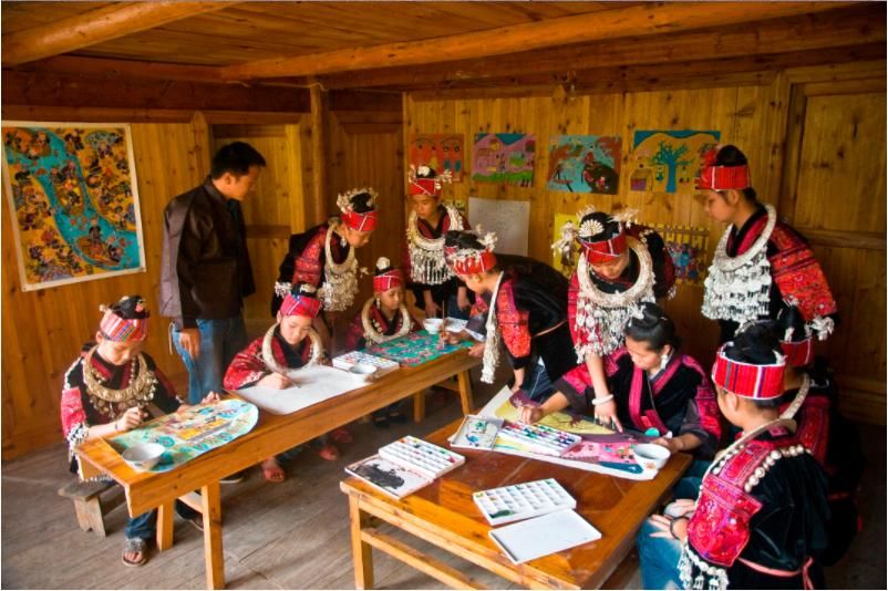 劍河現(xiàn)代民間繪畫(huà)源于傳統(tǒng)的苗族刺繡文化,是苗族刺繡文化的另一種表現(xiàn)形式和藝術(shù)升華。傳統(tǒng)的苗族文化多以服飾、歌舞為載體,并以刺繡及演唱等形式進(jìn)行表現(xiàn)和傳承。早期劍河現(xiàn)代民間畫(huà)即脫胎于具有適用性的苗族刺繡樣稿——剪紙和手繪刺繡粉本,換言之,手繪的苗族刺繡粉本便是劍河現(xiàn)代民間繪畫(huà)的雛形,劍河第一批優(yōu)秀的現(xiàn)代民間畫(huà)作者,即是原當(dāng)?shù)厥掷L粉本的能工巧匠。劍河現(xiàn)代民間繪畫(huà)多以苗族神話傳說(shuō)中的故事情節(jié)和民俗節(jié)日、生產(chǎn)活動(dòng)等內(nèi)容為題材入畫(huà),素材涵蓋自然界花鳥(niǎo)蟲(chóng)魚(yú)及人物、家畜等具體形象,造型稚拙天真,設(shè)色濃艷,對(duì)比強(qiáng)烈。作品傳達(dá)出典型的地域民俗氣息及濃厚的鄉(xiāng)土味,便是其標(biāo)志性特征。