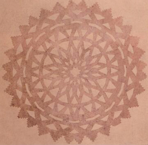 該剪紙出土于吐魯番市阿斯塔那303號墓,不僅保存完好,而且構(gòu)圖對稱、畫面均勻、線條流暢、美觀大方,可以和現(xiàn)代民間剪紙藝術(shù)相媲美。剪紙為圓形,呈土黃色,中心圖案為八角花形,依次向外為兩圈菱形花紋,交叉錯落,排列有序;再向外圈為梯形紋組成的三角形邊飾。整個剪紙圖案層次分明,變化繁復,頗有韻律感。這幅剪紙為折疊后一次剪成,造型簡潔,刀法洗練,具有古樸濃郁的民間風格。