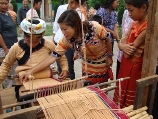 2010年上海世博會活動周期間,一臺名為《記憶云南》的18項非物質(zhì)文化遺產(chǎn)展示成為最吸引眼球的亮點之一?;顒蝇F(xiàn)場,18名云南非物質(zhì)文化遺產(chǎn)傳承人和民間藝人展示白族布扎、納西族東巴畫、傣族剪紙、傣族竹編、佤族織錦技藝等制作技藝。其間展示的佤族織錦技藝在民族文化風(fēng)情濃郁,文化底蘊深厚的耿馬縣佤族村寨里流傳甚廣。在耿馬的佤族村寨里,婦女們一般都會紡線織布,佤族傳統(tǒng)服飾也多用自染自織的土布縫制。此地佤族傳統(tǒng)服飾按地域分為兩大類。一類是分布在耿馬鎮(zhèn)、四排山鄉(xiāng)的傳統(tǒng)服飾,以女性身著佤族紅色短衣筒裙、男子身著佤族黑衣寬褲為標志;一類是分布在勐簡鄉(xiāng)大寨村的“黃衣阿佤”服飾,以女性身著佤族黃衣筒裙、男子身著黃衣寬褲為標志。佤族婦女所用的紡線有棉線、麻線兩種。棉主要是草棉,麻主要為苧麻和野生火麻,紡線采用內(nèi)地傳入的有紡錘的紡車。在耿馬鎮(zhèn)芒國村芒俄村民小組等佤族聚居村寨,筆者先后目睹了佤族織錦的全過程。只見紡織 中的佤族婦女一個個端坐在紡車前,凝神專注地操持著手中的活計。她們左手持麻,右手持紡錘,將紡錘放在大腿上一搓,紡錘轉(zhuǎn)動起來后,把麻纖維慢慢從左手拉出并捻成線,紡好一截線便將它繞到小竹棍上。如此這般不停地左右穿梭,又不斷地再搓、再捻,紡出的布匹紋理細密、結(jié)實挺拔。耿馬四排山鄉(xiāng)織錦的佤族婦女,大多采用一套竹木制的很原始的腰機,前后上下共有十七個零件。紡線時,她們將線的一頭栓在婦女腰上,另一頭用木棍穿好,擱在織布處釘在地上的兩根木樁上??棔r兩頭繃緊,將繞在木棍上的緯線穿到經(jīng)線的中間,然后用抒刀把線打緊。這種織法節(jié)奏雖然慢一些,但織出的布更加厚實緊繃,適用于紡織粗布和麻袋。在勐簡鄉(xiāng)大寨村的穿“黃衣”的佤族婦女,用黃土、玉米粉、茶葉、小飯豆、欖樹皮等7種植物做原料浸染的黃色棉線織錦,使用的有竹木制腰機和紡錘紡車兩種??楀\時,只見她們一邊捻線,一邊傳遞紡錘。不織時,又把紡錘和抒刀拆下,依然卷起放好。來自耿馬鎮(zhèn)、四排山鄉(xiāng)、勐簡鄉(xiāng)的佤族群眾介紹,中華人民共和國成立后,由于商店里賣的布料比佤族自織的布料更價廉物美,佤族人家自己紡織制作服飾的已經(jīng)不多,但是縫制麻布被和麻袋用的麻布,還是多數(shù)來源于自家紡織,尤其是佤族村寨婦女穿的裙子,也必須是自己織,不然會被人同族人恥笑為愚笨和懶惰。2009年以來,每年5月中旬,耿馬都要舉辦佤族“青苗節(jié)”慶典活動?;顒悠陂g,該縣不僅上演豐富多彩的文藝節(jié)目和民間體育比賽項目,還現(xiàn)場展示該縣獨具特色的佤族織錦技術(shù)??楀\展示中,來賓增長了對佤族傳統(tǒng)手工技藝方面的知識,不少圍觀群眾還饒有興趣地一邊詢問織錦者,一邊親自動手體驗這項古老而傳統(tǒng)的紡織技藝。