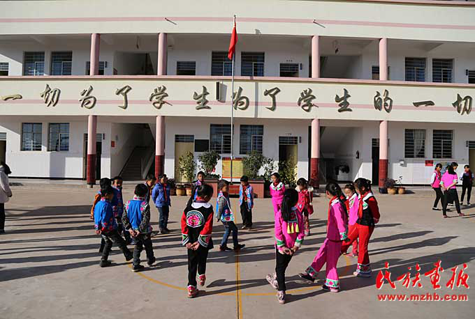 看過臘灣民族小學(xué)課間操的人都會說:“臘灣民族小學(xué)的課間操都是跳出來的?!比欢?,對于這所雙語教學(xué)的民族小學(xué)來說,其民族特色遠(yuǎn)不止于此。穿彝族傳統(tǒng)服裝、講彝語也是這里的教育特色。
