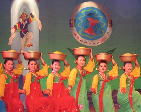 頂水舞因舞者頭頂水罐起舞而得名,是朝鮮族女性表演的傳統(tǒng)舞蹈。朝鮮族婦女習(xí)慣用頭部頂著器物行走,在插秧、鋤草季節(jié),婦女們常頭頂水罐將飲水或米酒等送至田間地頭。頂水舞即在這種生活習(xí)俗基礎(chǔ)上形成,而且一經(jīng)形成,便在群眾中間廣泛流傳。上世紀50年代初期,頂水舞在延邊各地隨處可見,成為當?shù)厝罕娮顝V泛的民間舞蹈之一。舞者頂?shù)乃?,原是生活中的實物,后來為了便于起舞,多用紙糊的罐型道具,在表層上繪以漂亮的花紋,輕巧別致。隨著道具變化,舞蹈動作也相應(yīng)發(fā)展。頂水舞以“挫墊步”“踏波步”“碎步”為基本步伐,主要動作有“甜泉舀水”“玉指彈珠”等。舞蹈通過模擬頂罐行進中的各種動作,抒發(fā)歡樂喜悅的內(nèi)心感情,舞姿輕松優(yōu)美。