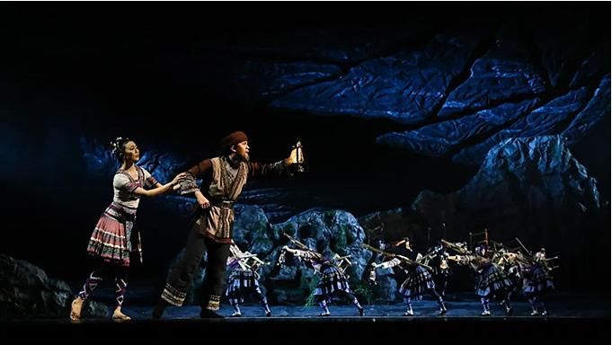 “花腰帶”既是精美的舞蹈道具,又是劇中人物情感的寄托,在整部舞劇中反復(fù)出現(xiàn)。特別是在雙人舞中,“花腰帶”將人物間無形的關(guān)系幻化成有形的聯(lián)系。劇中的蘆笙舞段,不僅僅是男女之間情愛的表達(dá),更突出表達(dá)了“開山人”為了讓窮鄉(xiāng)告別貧苦,為大愛舍小愛、努力奮斗的決心,以及對美好生活的向往。傳統(tǒng)民族舞蹈在這部劇中被賦予了不同的含義。