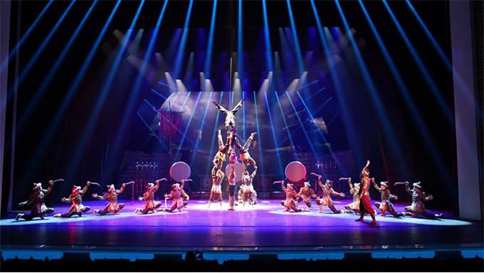 雜技是這部劇的一大亮點。新疆生產(chǎn)建設(shè)兵團雜技團近年來編創(chuàng)了《天鵝湖—男子倒立技巧》《向太陽—繩技》《春之韻—女子造型》等多個精品節(jié)目,并在國內(nèi)外重大雜技賽場多次獲獎?!稑翘m尋夢》中,主創(chuàng)團隊將這些獲獎節(jié)目進(jìn)行拆解,將蹬鼓、獨輪車、吊環(huán)、肩上芭蕾、水流星及舞中幡等雜技技巧與戲劇元素相融合,讓觀眾猶如置身于黃沙漫漫的絲路古國。