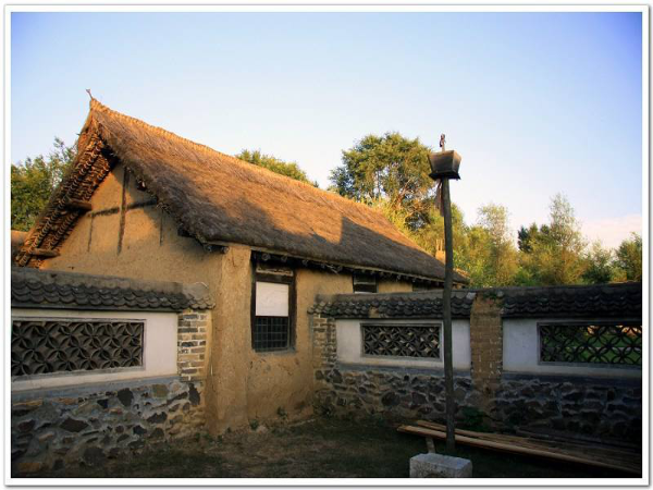 傳統(tǒng)的滿族民居的屋頂一般采用草屋頂或瓦屋頂。屋頂蓋草俗稱“苫房”,在北方農(nóng)村,這是一種很高超的手藝。通常要在木結(jié)構(gòu)的構(gòu)架頂部,先鋪上用秫秸桿(高粱桿)或者樹條子編扎的“房芭”,再抹泥填補(bǔ)縫隙。在其上面,將草的根部朝下,層層覆蓋,為防止滑落和被風(fēng)吹散,還需要用草繩依次交叉加固。草房頂鋪設(shè)齊整,久經(jīng)風(fēng)雨,草就變成了黑褐色,因此也叫“海青房”。