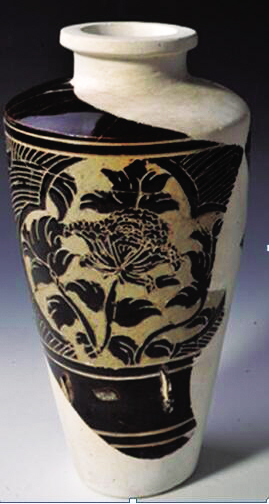 西夏經(jīng)瓶是靈武窯最具特色的西夏器類之一,其器型瘦長,肩部最寬,下腹?jié)u收,平底,假圈足;胎質(zhì)細膩致密,外壁施釉均不到底,內(nèi)壁施滿釉,釉色以褐釉為主,也有黑釉,白釉少見,白釉瓷均施化妝土;紋飾以牡丹花為主,也有菊花,少見海棠花,輔紋以海水波浪紋和斜線紋為主,花紋細膩,構(gòu)圖流暢,疏密得當;整體構(gòu)圖大量使用開光,搭配合理,講究對稱。