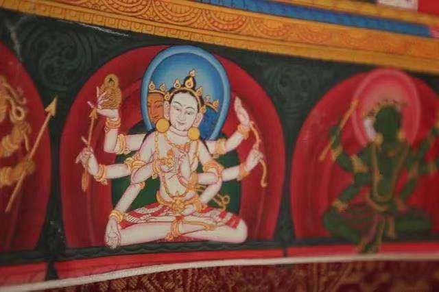 900多年前流傳于衛(wèi)藏地區(qū)(現(xiàn)山南)的齊烏崗派唐卡,由雅堆·齊烏崗巴創(chuàng)立,與嘎瑪嘎赤畫派、勉塘畫派、欽孜畫派、埃赤畫派并稱“唐卡五大畫派”。齊烏崗派特點(diǎn)為人物體形飽滿、生動(dòng)細(xì)膩,色彩以棗紅、橘紅暖色系為主;中央的主尊突出,背景多用卷草紋作為裝飾。特別是,齊烏崗派唐卡的佛像肩膀旁都有象征翅膀的“三角”,源于創(chuàng)始人齊烏崗巴行動(dòng)靈敏,亦被稱作“齊烏派”。