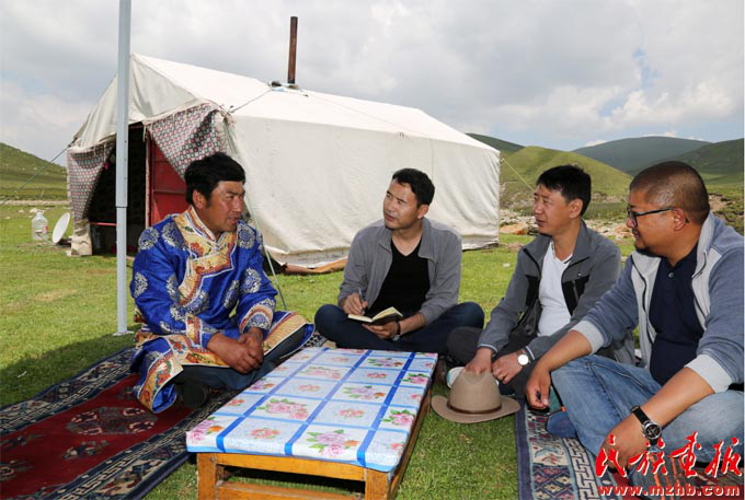 土旦(左)入戶向牧民宣傳草原法律法規(guī)和國家相關草原保護政策(黃若天 攝影)