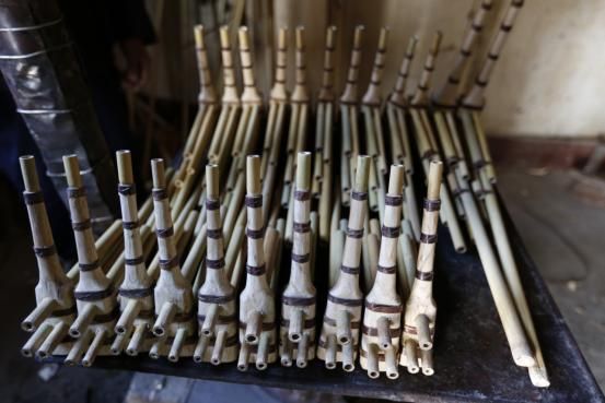 與舞臺表現(xiàn)所用的十幾管甚至二十幾管的蘆笙不同,高坡蘆笙主要是苗族傳統(tǒng)的六管蘆笙,分為大中小不同型號。蘆笙的制作材料為苦竹(蘆笙竹),原來主要產(chǎn)于貴定縣鞏固鄉(xiāng)的楊柳塘,1985年后,他們從楊柳塘將蘆笙竹移栽至高坡鄉(xiāng)批林等地,成為目前制作蘆笙的主要原料。