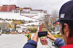 3月1日,布達(dá)拉宮管理處講解員次仁卓嘎(左)在進(jìn)行直播