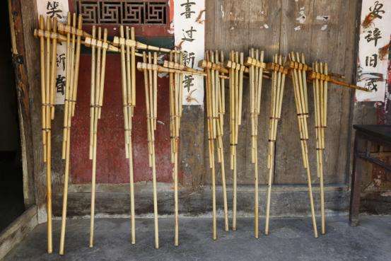 他想去想來,在家后面有一片竹林,他就用竹子一管一節(jié),用綿條做成簧片,裝在竹管里面吹發(fā)出聲音,每一根竹管發(fā)出的聲音都不同。他就發(fā)給這些兄弟每人一截,二兄弟比老三的長一點,老三比老四的長一點,老四比老五的長,老六就是最短的。大家晚上回來,大哥就說,你們干活真的挺賣力,每天都不知道怎么請你們吃飯,所以我想了一個辦法,以后每天聽到我發(fā)出的聲音,說明我已經(jīng)做好飯可以吃了,你們就回來互相打信號。大家都說,大哥是一個聰明人,這個辦法很好。