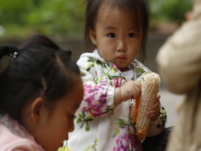 貴州貴陽(yáng)苗族老年人與兒童剝玉米