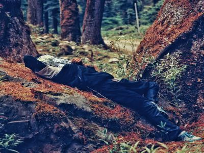 在路邊小憩的放映員